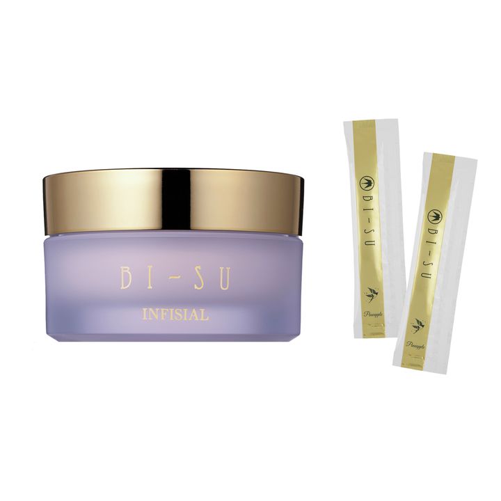 右:飲んだ後の内側から湧き上がるようなツヤ感がすごい! 健康を維持するためにも必要だと実感。パイナップル味で飲みやすい。天然アナツバメの巣のエキスを独自技術で凝縮。BI-SU エキスゼリースティック 12g×30本入り ¥16,200()