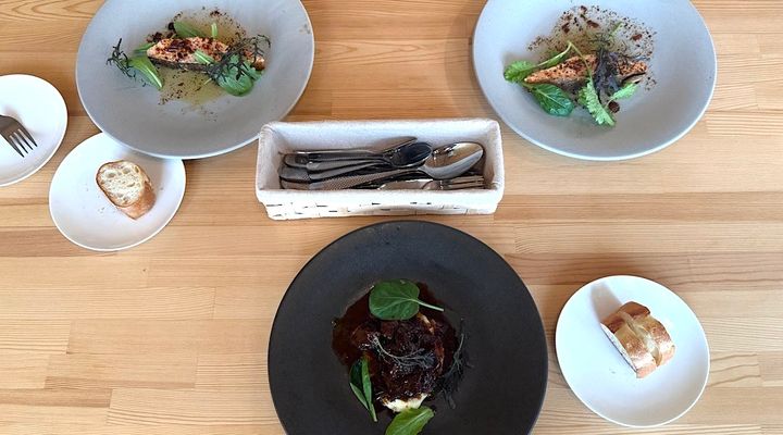 友達のサーモンのポワレと、私の黒毛和牛ほほ肉の赤ワイン煮込み