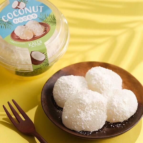 ココナッツ風味のわらびもちにココナッツソースを入れ、さらにココナッツパウダーをたっぷりかけたスイーツです。もちもち食感とココナッツの香りが楽しめます。