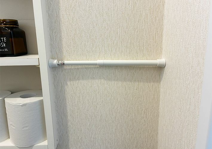 筆者のトイレには、備えつけの棚と壁の間に25cmの空きスペースがあったので、最大28cmまで伸びる短めのつっぱり棒をセットします。