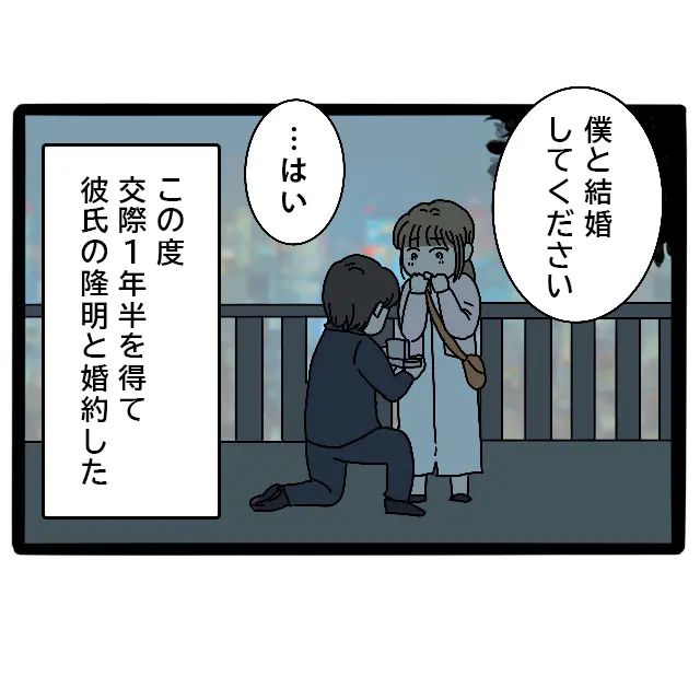 私はカオリ。この日、付き合って1年半の彼氏隆明がついにプロポーズしてくれました。夜景の見える公園で「僕と結婚してください」と片膝をついて差し出された指輪。すごく特別で、映画のヒロインになったみたいでとても嬉しかったです。もちろん、「はい」と答えて、私たちは婚約しました。