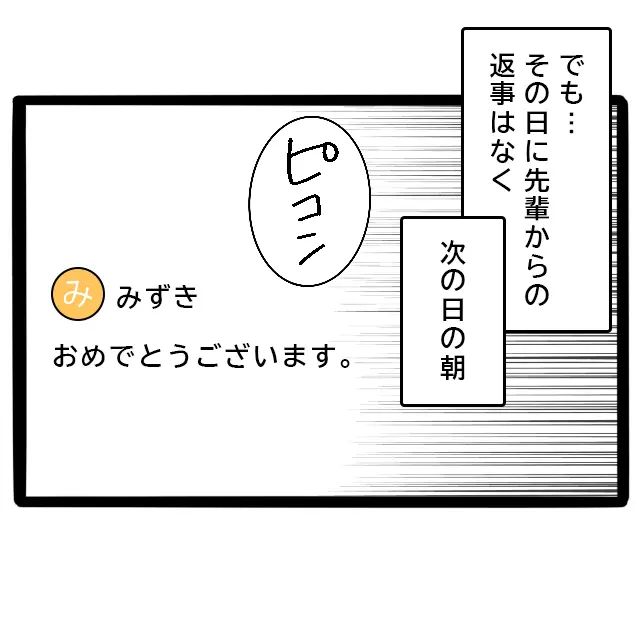 わくわくした気持ちで先輩からの返信を待っていましたが、結局その日、先輩からの連絡はありませんでした。翌朝になって、「おめでとうございます。」と1行。え、敬語?兄と結婚してからも、私とは先輩後輩の仲は変わらずにいたので、すごく違和感がありました。