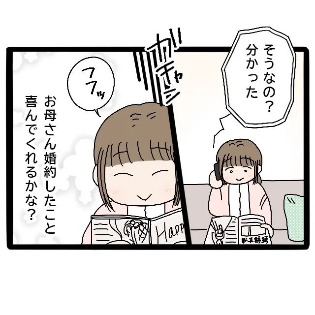 お母さん、私が婚約したこと喜んでくれるかな?「えぇ!おめでとう」と笑顔になる母の顔を思い浮かべて、私はひとり微笑んでいました。今週末が楽しみです。