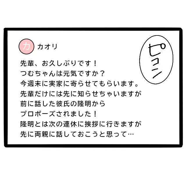 みずほ先輩には誰より先に知らせようと思い、私はプロポーズされたことをメッセージで報告しました。そして週末に実家に泊まりに行くことも伝えました。楽しみだなぁ。