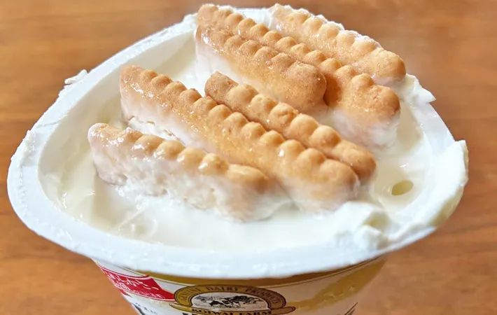 1.『小岩井生乳100%ヨーグルト』に『ココナッツサブレ』を入れる