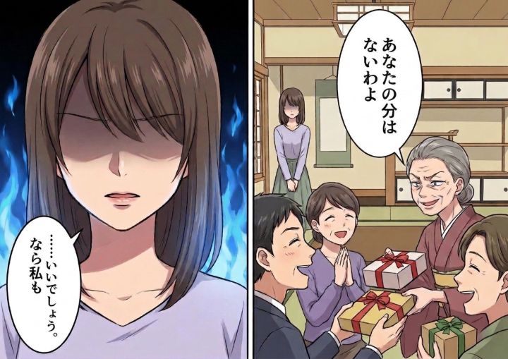 私は立ち上がり、「今日は皆さま、お集まりいただきありがとうございます」と挨拶をしながら、用意した手土産を親戚一人ひとりに手渡していきました。皆が嬉しそうに受け取る中、最後に残ったのは義母だけでした。義母は当然、豪華なプレゼントがもらえるものと期待に満ちた顔で私を見ていました。私はそんな義母の前にスッと立ち、笑顔で言い放ちました。