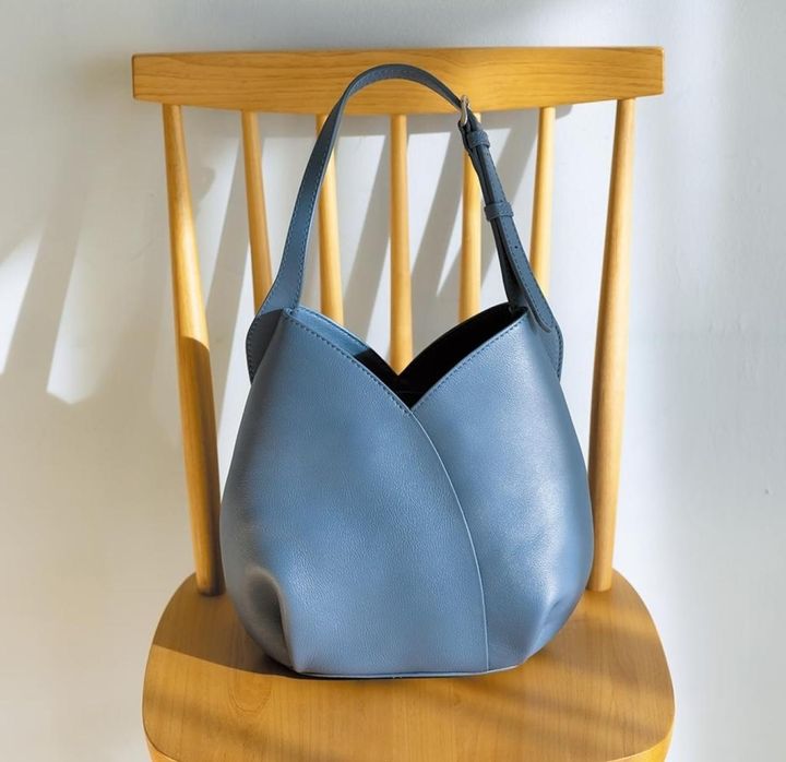 水芭蕉の花をイメージしたという曲線が美しい小ぶりのバッグ。ハンドルの長さを調節して肩掛けにもできます。きめ細やかな牛革の質感と、落ち着きのあるサックスブルーが上品。