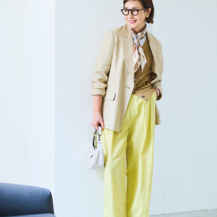元気で明るい印象をもたらすレモン色のパンツ。ベージュのジャケットを合わせるとまろやかになり、上品さに拍車がかかります。