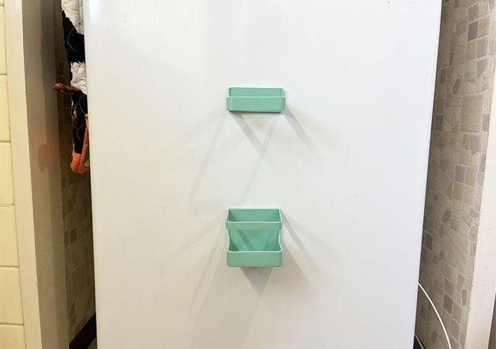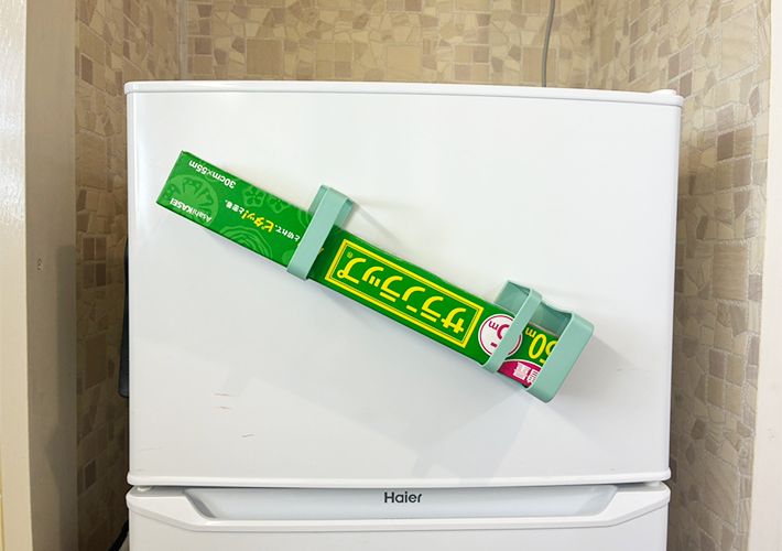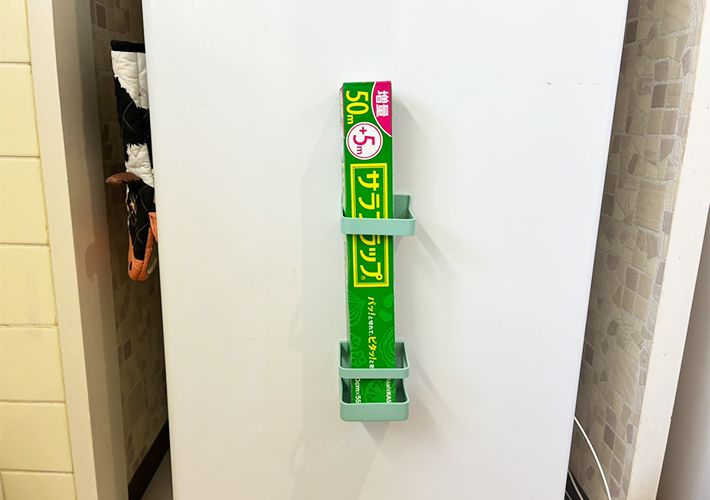 そこで、冷蔵庫の側面にマグネット傘立てを縦に貼りつけて、ラップ類の定位置を作ってみることに。