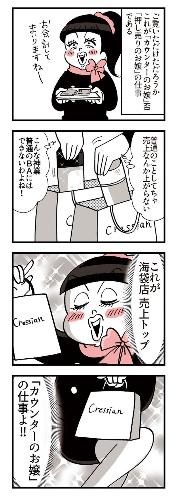 百貨店のコスメ売り場でビューティーアドバイザー(BA)として働く桜城まち子。常にトップの売上を誇る彼女についた異名は「カウンターのお嬢」。誰もがカリスマBAとして崇めている――と思っているのは本人だけで、周囲からは「押し売りのお嬢」と言われていた!? 売り場の同僚は助け合う仲間ではなく、売上を競う敵でしかない! 売り上げのためならなんだってする、憎めない悪女のデパコス職場コメディ『デパコスカウンターは今日も修羅場です ~BA下剋上物語~』。デパートで美しく微笑むBAたちの修羅場をお楽しみください。
