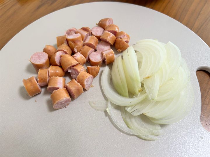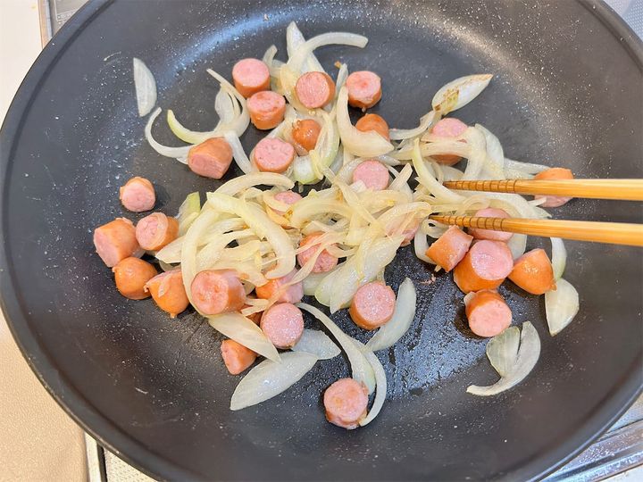 3. 玉ねぎは半分に切って5mm幅の薄切り、ウインナーは1cm幅の輪切りにする。フライパンにオリーブオイルを引き、玉ねぎとウインナーに塩、こしょう、ガーリックパウダーを振り炒める。