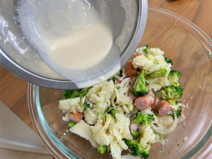 5. 4[A]1のブロッコリーを加え、しっかり混ぜ合わせる。