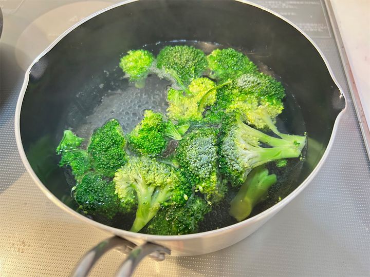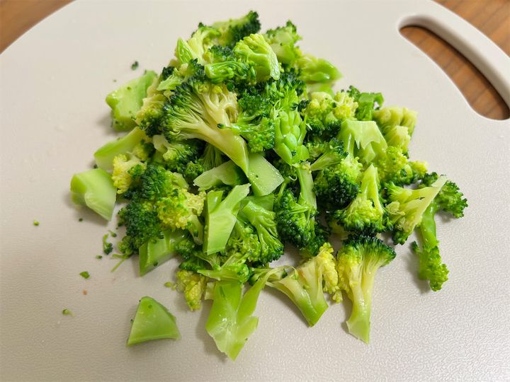 1. ブロッコリーを小房に分けて、沸騰したお湯(分量外)で約1分茹でる。茹で上がったら湯切りして、細かく切る。