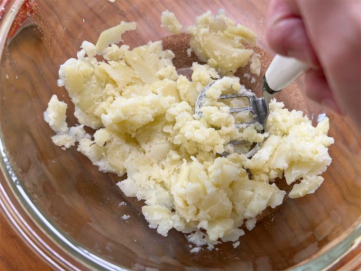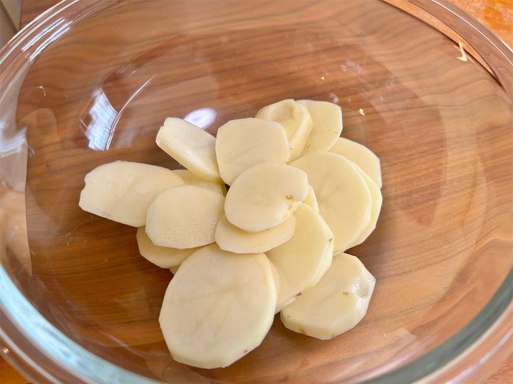 2. じゃがいもは、皮を剥き5mm幅の薄切りに。耐熱容器に入れて、600Wの電子レンジで約5分加熱する。竹串がスッと通るくらいの軟らかさになればOK。熱いうちに潰しておく。