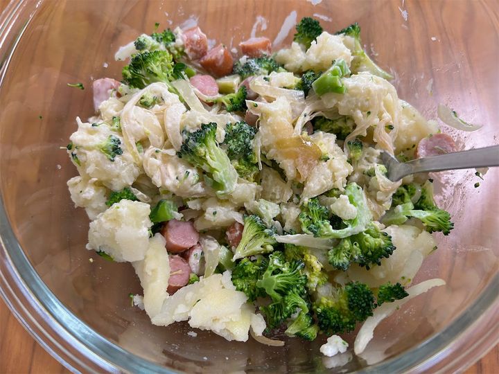 4. 2のじゃがいもに、3の炒めた玉ねぎとウインナーを油ごと加えて混ぜ合わせる。