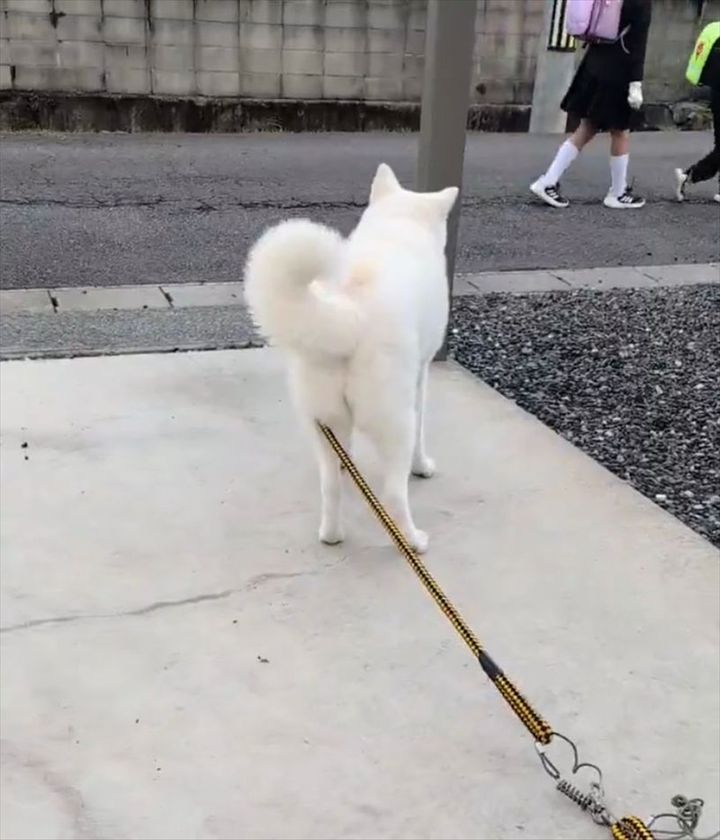 通学中の小学生を見送っている白い毛並みをした秋田犬。 交流できて嬉しいのかしっぽをブンブン振っていましたが・・・
