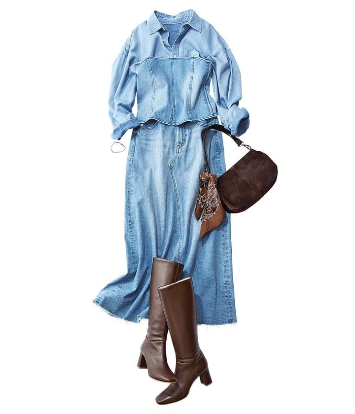 デニムスカート¥36,300ビスチェ¥23,100シャツ¥31,900(すべてヤヌーク/カイタックインターナショナル)バッグ¥24,900(トゥティエ)バンダナ¥3,300(シー/エスストア)ブーツ¥42,900(ダイアナ/ダイアナ 銀座本店)ブレスレット¥27,500(アビステ)
