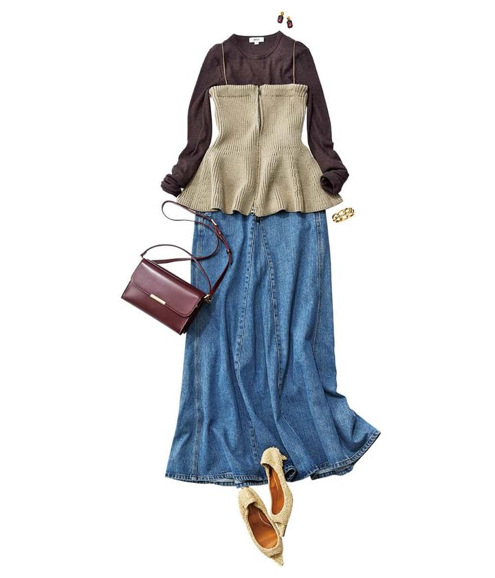 デニムスカート¥19,800(サムシング/エドウイン・カスタマーサービス)ニットビスチェ¥33,000(THIRD MAGAZINE)ニット¥27,500(エーゴールドイー/シチズンズ・オブ・ヒューマニティ)バッグ¥16,500(アンタイトル)パンプス¥36,300(PIPPICHIC/ベイジュ)ピアス¥12,760(マイケル・ナッシュ・ジュエリー/ZUTTOHOLIC)バングル¥14,300(アビステ)