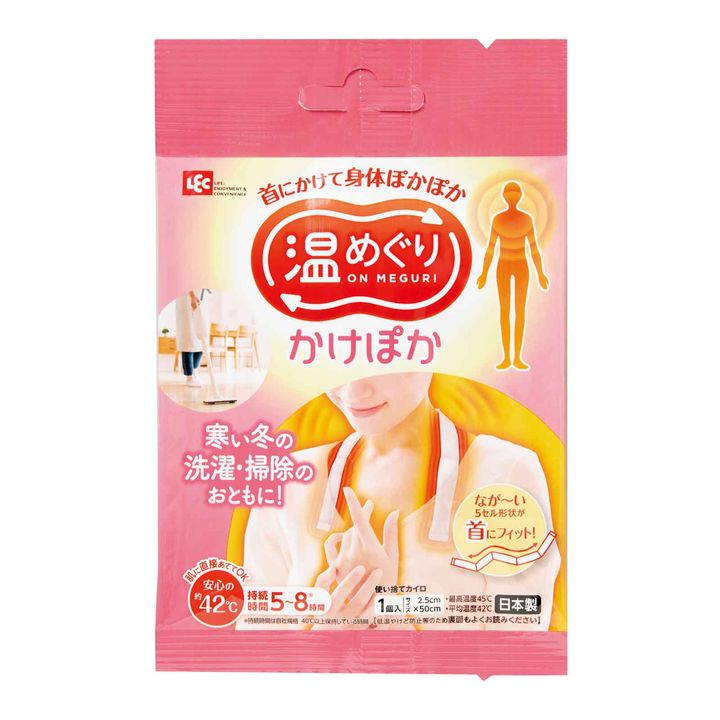 首にかける使い捨てカイロ。42℃の温かさが5〜8時間持続。首の太い血管を温めることで全身が温かくなりめぐりが良くなります。温めぐり かけぽか ¥248(LEC)