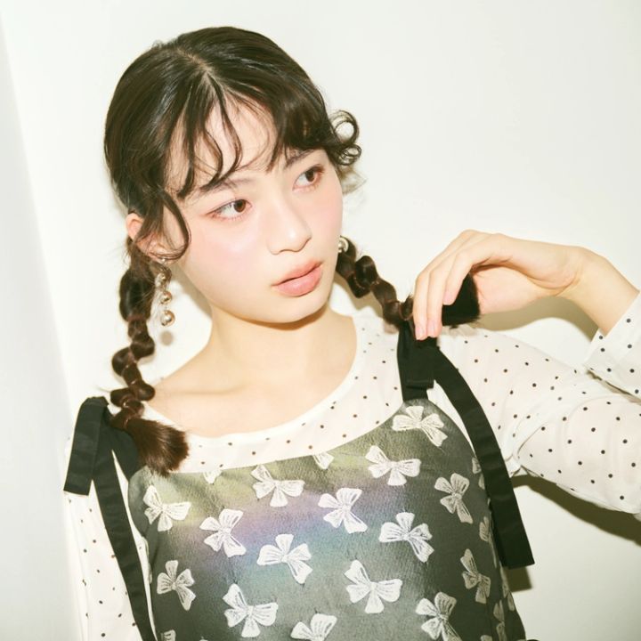 全体の髪を真んなかで分けたら、正面からも少し見える耳の横でそれぞれ結んでツインテールをつくる。結ぶ高さは同じに。