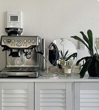 「エスプレッソマシンを置いている白い棚は、実はシューズボックスとして販売されているもの。サイズや仕様がちょうどいいので、わが家ではキッチン棚として愛用しています。木目調とルーバー扉が、部屋の雰囲気をやわらかくしてくれるのがお気に入り」(Jiuさん・会社員)
