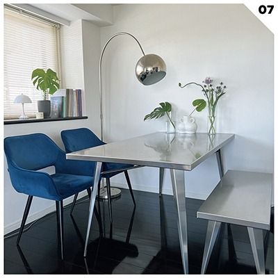 「インテリアはシルバーを基調にしていて家具はステンレス製がメイン。KAREのダイニングチェアはデザインに惹かれて青を選びましたが、シルバー×ブルーのモダンな配色がお気に入り。季節の花を飾って彩りもプラス」(永倉遥さん・iruryディレクター)
