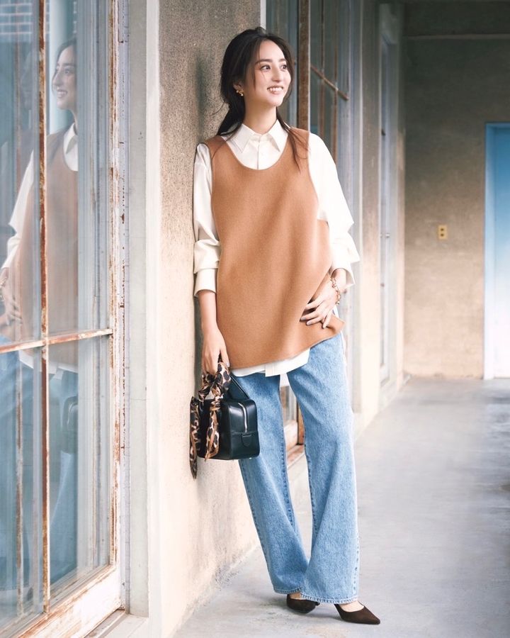 シャツ¥47,300(カオス/カオスGINZA SIX)ベスト¥36,300(HER.)デニムパンツ¥30,800(ボニーウーブン/クローバーズ)ピアス¥33,000ブレスレット¥99,000(ともにブランイリス/ブランイリス トーキョー)バッグ¥68,200(メゾン カナウ/ヤマニ)巻いたスカーフ¥16,500(マニプリ)パンプス¥64,900(ネブローニ)