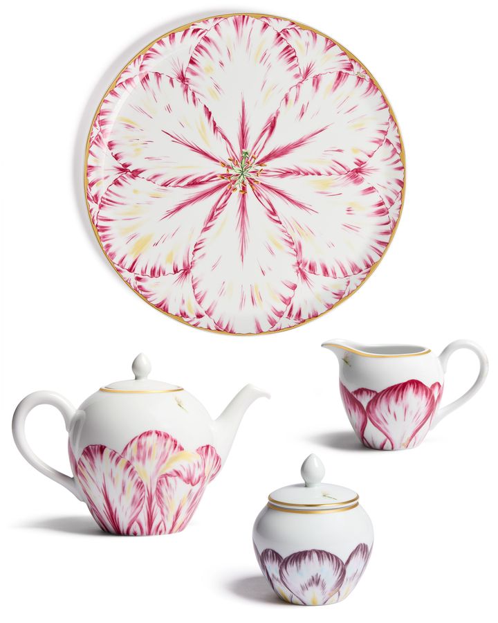 プレートやカップのほかにも、ピンクのチューリップに彩られたティーポットやクリーマー、ラウンドプラッター、そしてパープルのシュガーボウルもラインナップ。ティータイムのテーブルをリュクスに演出する一式が揃います。