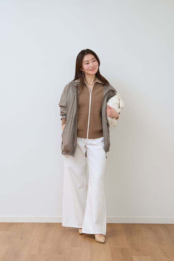 ミラノリブフルジップカーディガン¥5,990 ライトウェイトパーカ¥5,990 ローライズワイドジーンズ¥4,990(すべてユニクロ:シー/ユニクロ)※カーディガン、パーカはMサイズを着用、ジーンズは25インチを着用、バッグ、靴(ともに私物)