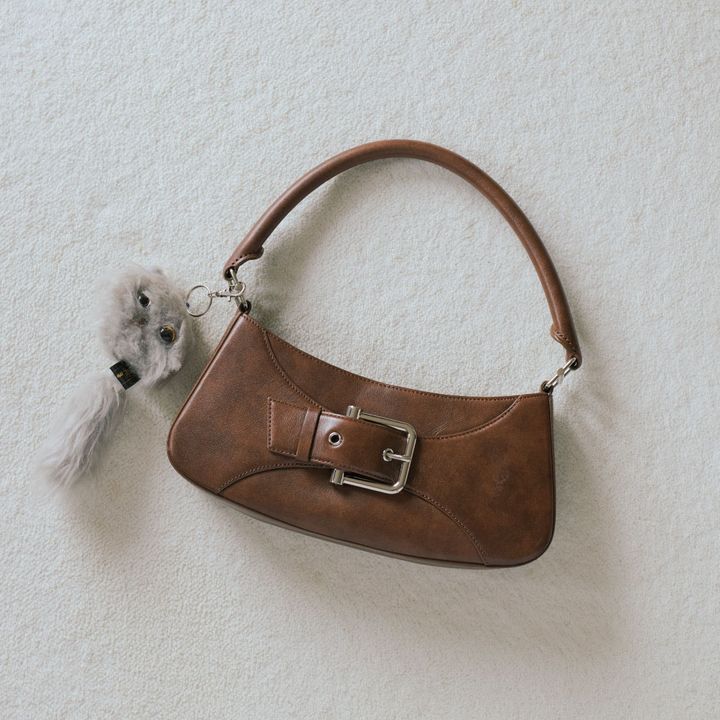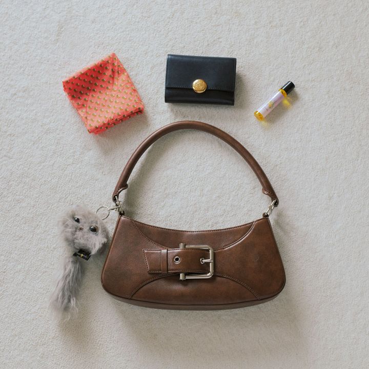 「『オソイ』のバッグは私の好きなブラウンを選びました。肩掛けしやすく、体にぴたっと寄り添ってずり落ちてこないのが◎。ポケット付きで仕分けにも便利。チャームは『ザ・メイドインミックス』のオリジナル。一緒に暮らしている愛猫をモチーフにつくってもらいました」
