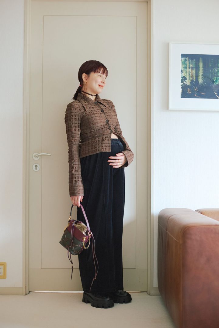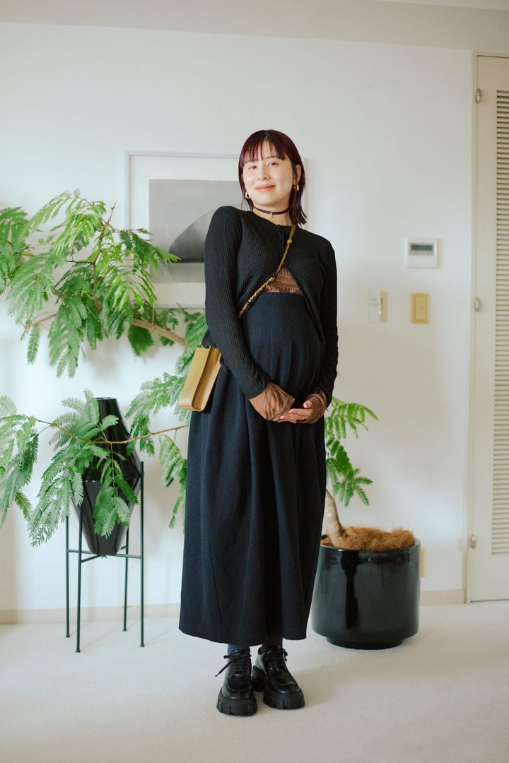 「お腹まわりをカバーすると全身がボリュームアップして見えるので、タイトなボトムを選びラインを出すのがこだわり」。メリハリは大事にしつつ、やわらかな素材を選んでストレスフリーなおしゃれを楽しんでいるのだとか。