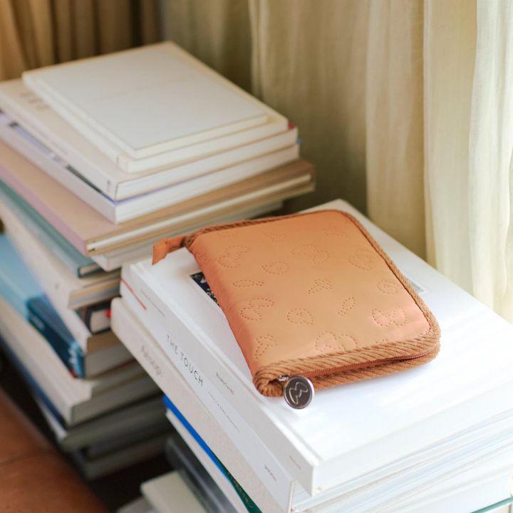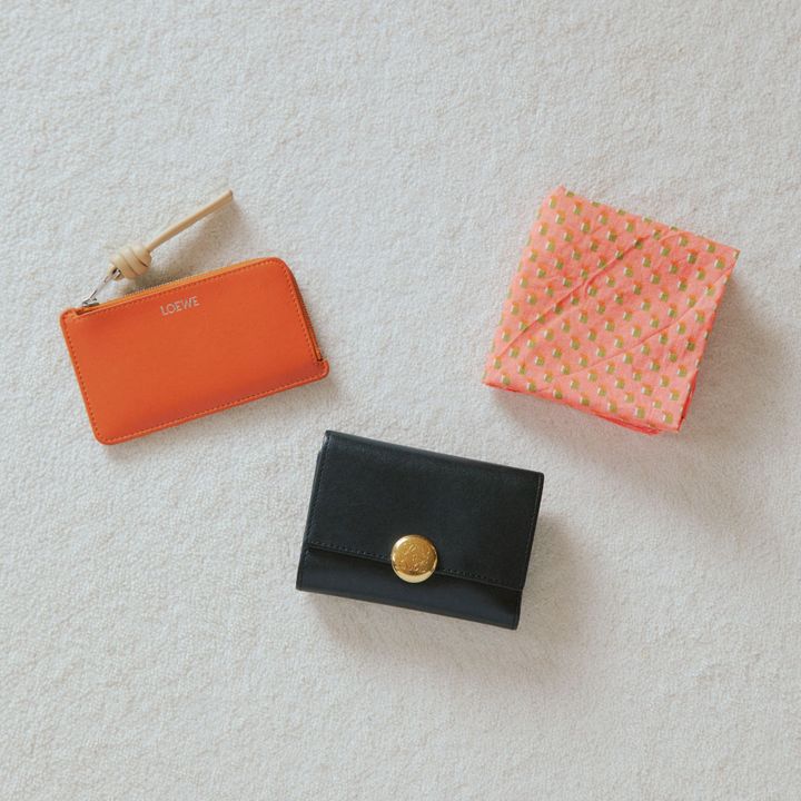 「ハンカチはヴィンテージショップで購入。お財布と名刺入れは『ロエベ』のもの。『ロエベ』は、シックさの中にも遊びが効いていて可愛い! キャッシュレス決済が多いのでお財布は軽量化していますが、現金が必要な場面では焦ってしまうことも(笑)。ダークトーンなお洋服が多い分、名刺入れやハンカチはカラフルに」