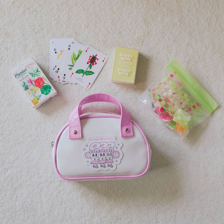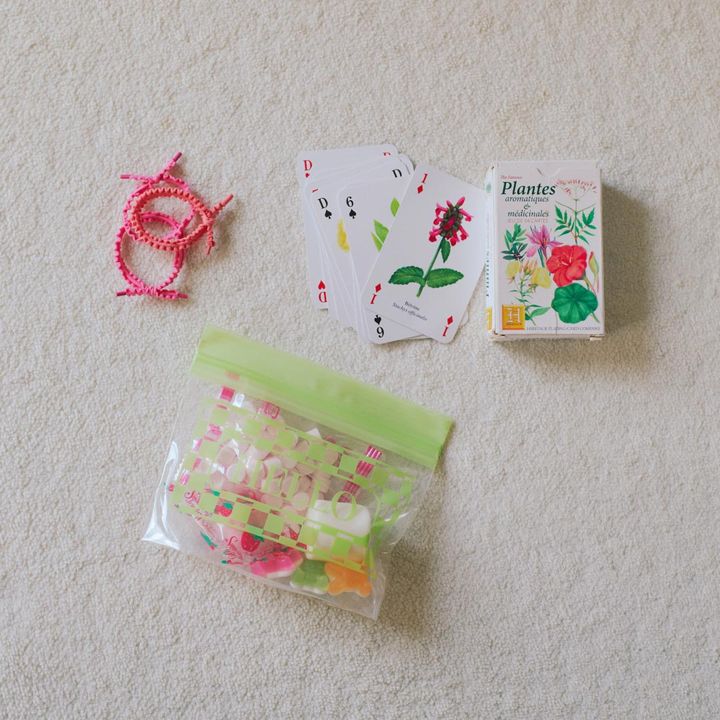 「ヘアゴムは『スリーコインズ』で。トランプは、私が独身時代にフランスで購入したもの。まさか娘の遊び道具になるとは! と、私自身が驚いています(笑)。ジップ付きの袋には、ラムネやマシュマロ、グミなどを。家にたくさんお菓子があるので、好きなものを選んで詰め込んでいます」
