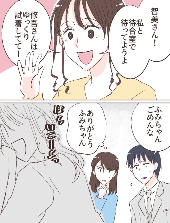「智美さん!私と待合室で待ってようよ。修吾さんはゆっくり試着しててー」ふみのがそう言ってくれ智美さんを連れ席を外してくれることに。「ふみちゃんごめんな」「ありがとう、ふみちゃん」と私と修吾がお礼を伝える間に「ほら、いこーよっ!」と智美さんに声をかけ出て行きました。