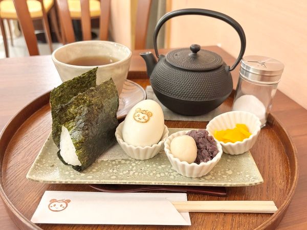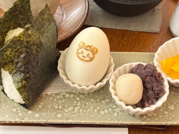 鉄製の茶器に注がれたほうじ茶はなんと三杯分!和のクラシカルなお皿にはふっくら握られたおにぎり、可愛いたぬきが刻印されたゆで卵、お茶請け、小豆&白玉が添えられています。