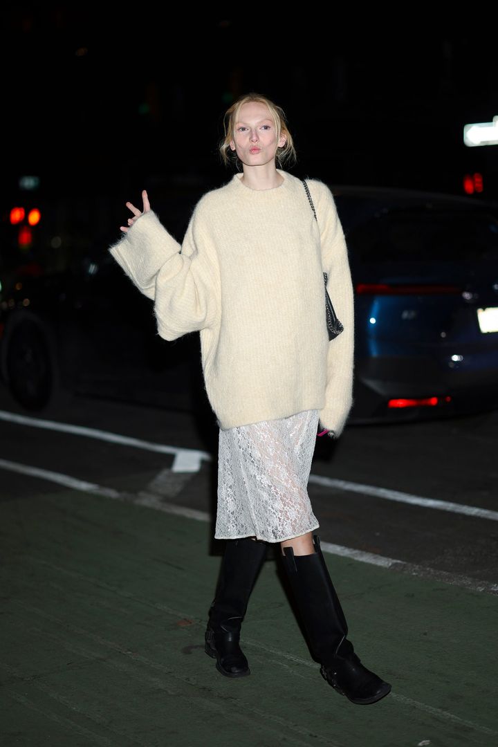 ひっぱりだこのトップモデル、アレックス・コンサーニ。彼女のひざ丈ハーネスブーツとオーバーサイズのシャギーニットを見ればわかるように、定番アイテムだからといって控えめである必要はない。グランジテイストのアイテムに、レースやシアーなディテールを合わせてバランスをとった甘辛ミックスは、すぐに取り入れられそう。