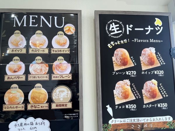 水曜、木曜のみ営業ですが、ほっとしたひととき、お友達と、自分へのご褒美などなど色々なシーンで楽しめる美味しい生ドーナツ。あなた好みのクリームで楽しんでください。