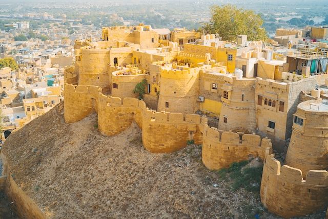 ジャイサルメールは、タール砂漠の中に現れる黄金色の町。夕方になると黄色い砂岩の建物が太陽の光を受けて金色に輝くことから、「黄金の町」とも呼ばれています。中世にはシルクロード交易の中継地となり、砂漠を行き交う商人たちが集まる交易都市として栄えました。町の中心にそびえる世界遺産・『ラージャスターンの丘陵城塞群』の一つであるジャイサルメール城には、現在も内部に人が暮らしています。迷路のような細い路地には土産物店やカフェが並び、インド国内外から訪れる観光客でにぎわう町です。