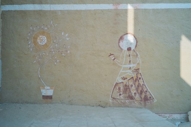 村の中央には寺院のような建物が残り、柱や入り口には細かな彫刻が施されています。家々の壁には格子窓の跡や壁画も残り、この村に暮らしていた人々が比較的豊かなコミュニティだったのだろうか……と想像が膨らみます。