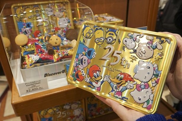 新作グッズも続々。編集担当のイチオシは、アソートスウィーツ。ゴールドのホログラムにパークの仲間たちがデザインされたエンボス加工の缶には、クッキーやクランチチョコが詰まっている。個包装にはパークの25周年を振り返るクイズがプリントされていて、友達と食べれば盛り上がること間違いなし。