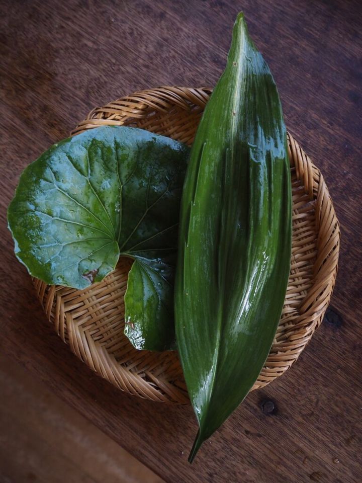 左から、庭から摘んだ石蕗(ツワブキ)と葉蘭。