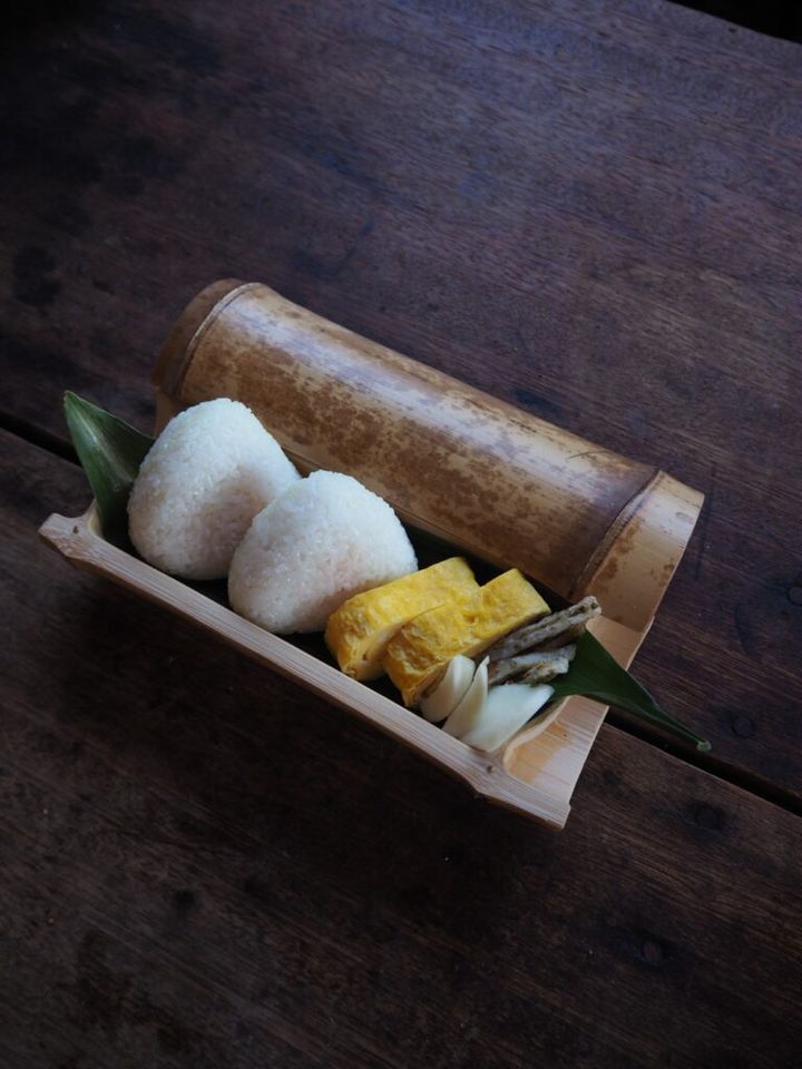 今日はお気に入りの竹のお弁当箱に、焼き鮭のおむすびと厚焼き玉子を詰めた。