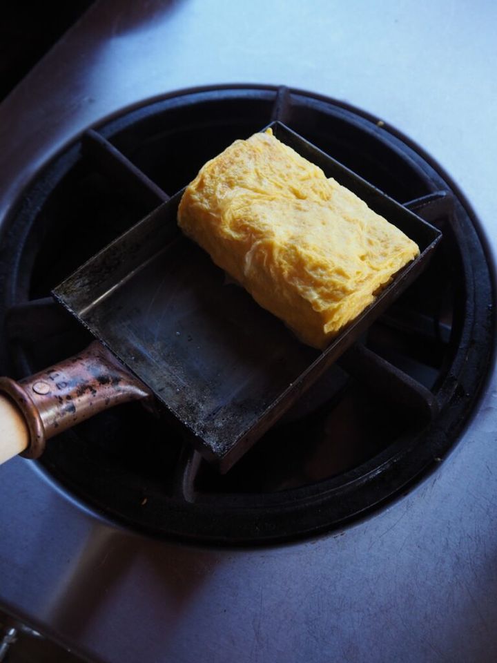 3. 火をつけて温めた卵焼き器に油を多めに入れ、卵液を少量流し、手前に集めるを繰り返して焼きあげる。