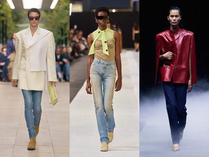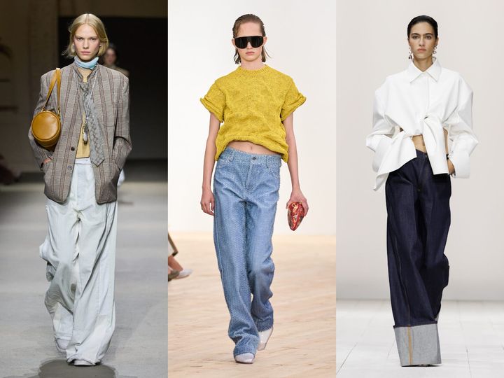 外側の曲線が美しいバレルレッグデニムは数シーズン人気が続く。タックを入れることでよりボリュームを出したスポーツマックス。ステラ マッカートニーは、エレガントなペプラムジャケットとルーズなデニムのコントラストが新鮮。ヴィクトリア ベッカムはコンパクトな肌見せトップとタック入りデニムでヘルシーな夏スタイルに。