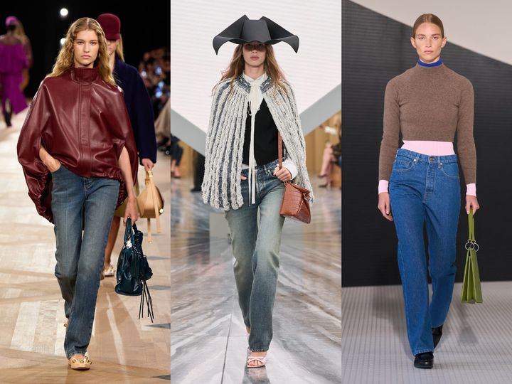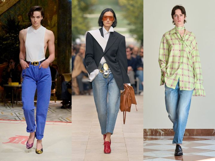 メンズライクなワイドデニムの人気は健在。コーチはハイウォッシュのワイドデニムをチェック柄ジャケットでレトロに大人っぽく昇華。実際にはラムスキン製でデニムのような風合いのロエベのパンツは、トップはクロップド丈でコンパクトにまとめて。ボリュームのあるジバンシィのロールアップデニムは白シャツとの組み合わせでクリーンなフェミニニティを演出。