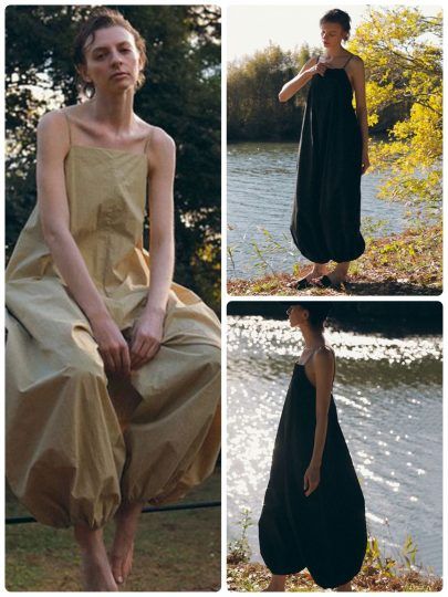 落ち感のある素材で仕立てたタンク型オールインワンは、インナー次第で表情を変えられるので便利。さらりと軽いので、春はもちろん夏場まで活躍します。ウエストに施した紐をブラウジングすることで、シルエットを調整できる点も高ポイント。