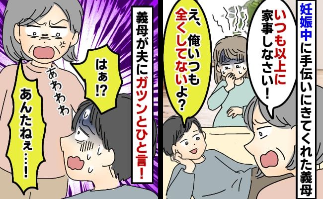 私は長女を妊娠していたとき、つわりがつらくてまともに家事をこなせていませんでした。そんな状況を知った義母が手伝いに来てくれますが、夫のある言動が義母の怒りに触れて……。