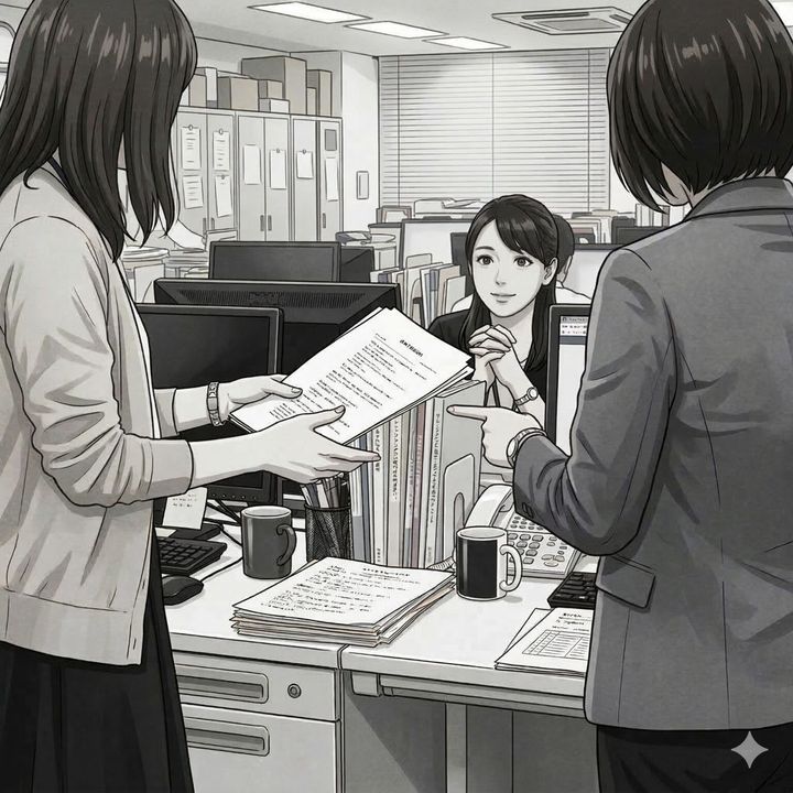 オフィスが一瞬にして静まり返りました。仕事を押し付けようとした先輩は、明らかに動揺して取り繕います。