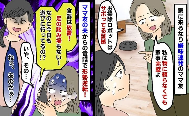 児童館で知り合ったママ友Aさんを自宅に招いたところ、家中を物色し、自分の家事や夫がどれだけすぐれているかというマウント発言を連発。ところが、ある人物からの電話をきっかけに、Aさんの様子が一変。遊びに来たはずのAさんが、赤面して帰ることになった理由とは……?