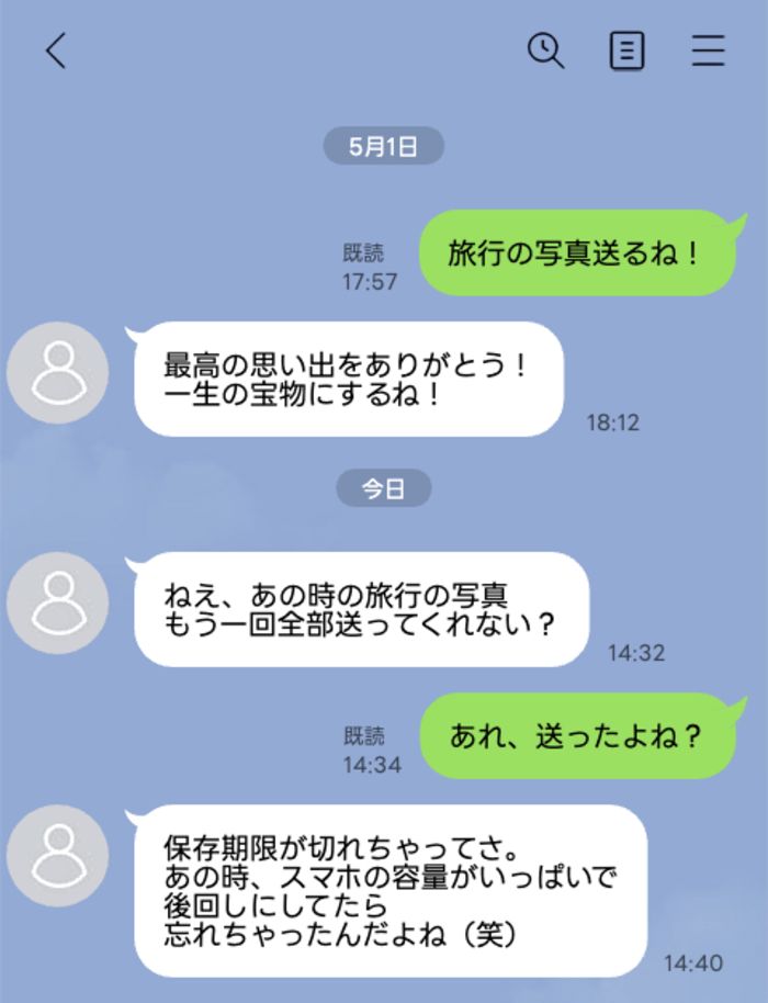 「ごめんね、私もスマホのストレージを空けるために、送った後は全部削除しちゃったの。バックアップも取ってないんだ」